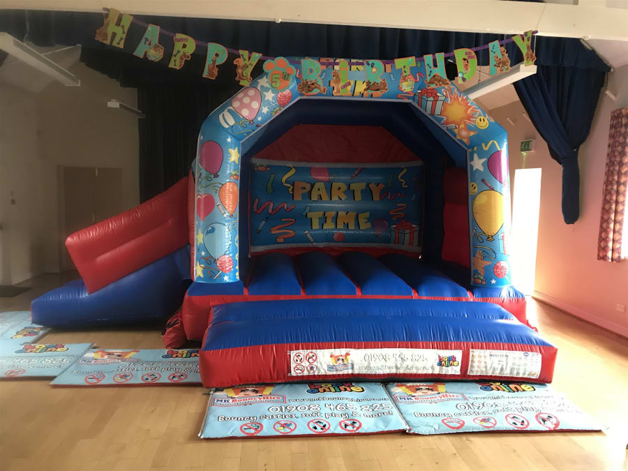 To book this PARTY TIME BOUNCE themed bouncy castle and Slide COMBO, just use the big buttons below - you can even check its availability against our live diary! Our advanced online booking system collects all the information we require, and we will confirm your details with a email. Or, if you have any questions about this or any other product on the website please call us on 01908 465825 or visit our 'Contact Us' page for other options.