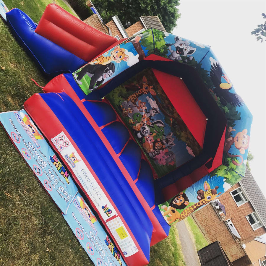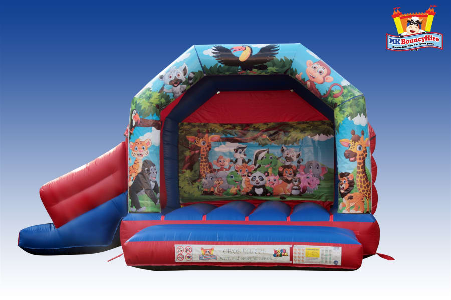 This JUNGLE FUN Themed Bouncy Castle with Slide COMBO has long been very popular at all events being held in and around Milton Keynes. If you want to have a 'wild time' then this is the right inflatable for you! A fantastic design full of fun animals including Giraffe, Monkeys, Gorilla, Tiger, Lion, Crocodile, Snake, Elephant, Toucan, Turtle and more!