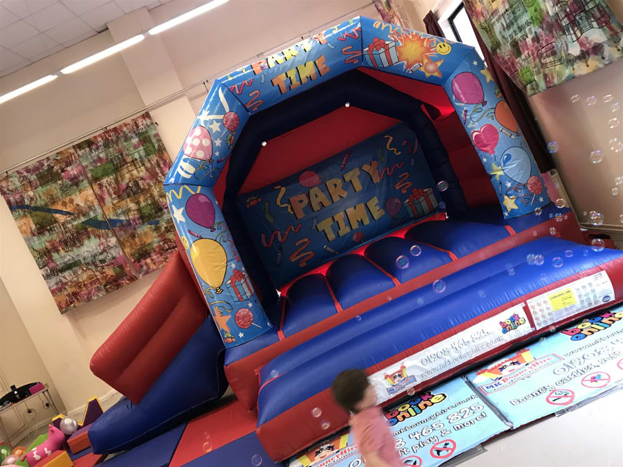 To book this PARTY TIME BOUNCE themed bouncy castle and Slide COMBO, just use the big buttons below - you can even check its availability against our live diary! Our advanced online booking system collects all the information we require, and we will confirm your details with a email. Or, if you have any questions about this or any other product on the website please call us on 01908 465825 or visit our 'Contact Us' page for other options.
