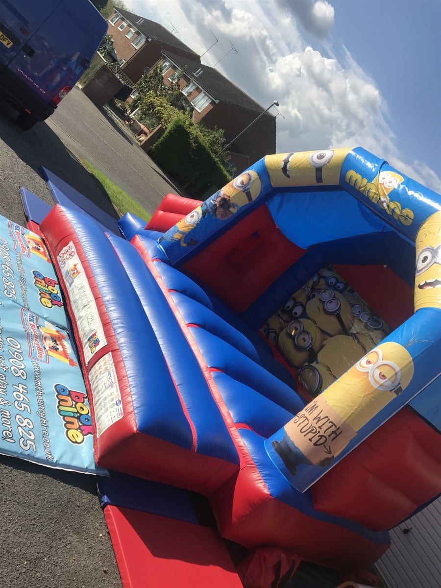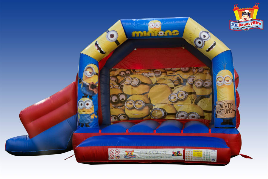 To book this MINIONS themed bouncy castle and slide COMBO, just use the big buttons below - you can even check its availability against our live diary! Our advanced and innovative online booking system collects all the information we require, and we will confirm your details with a email. Or, if you have any questions about this or any other product on the website please call us on 01908 465825 or visit our 'Contact Us' page for other options.