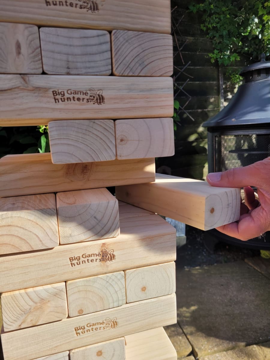 Our Giant Garden Jenga is an old classic that everyone will enjoy. Suitable for all ages and great fun for any occasion you may be having. Contains 58 wooden blocks Each block measures 210mm long x 70mm wide x 45mm high. The tower starts at 0.9m high and can go up to 2.3m maximum during playing depending on how steady your hand is.